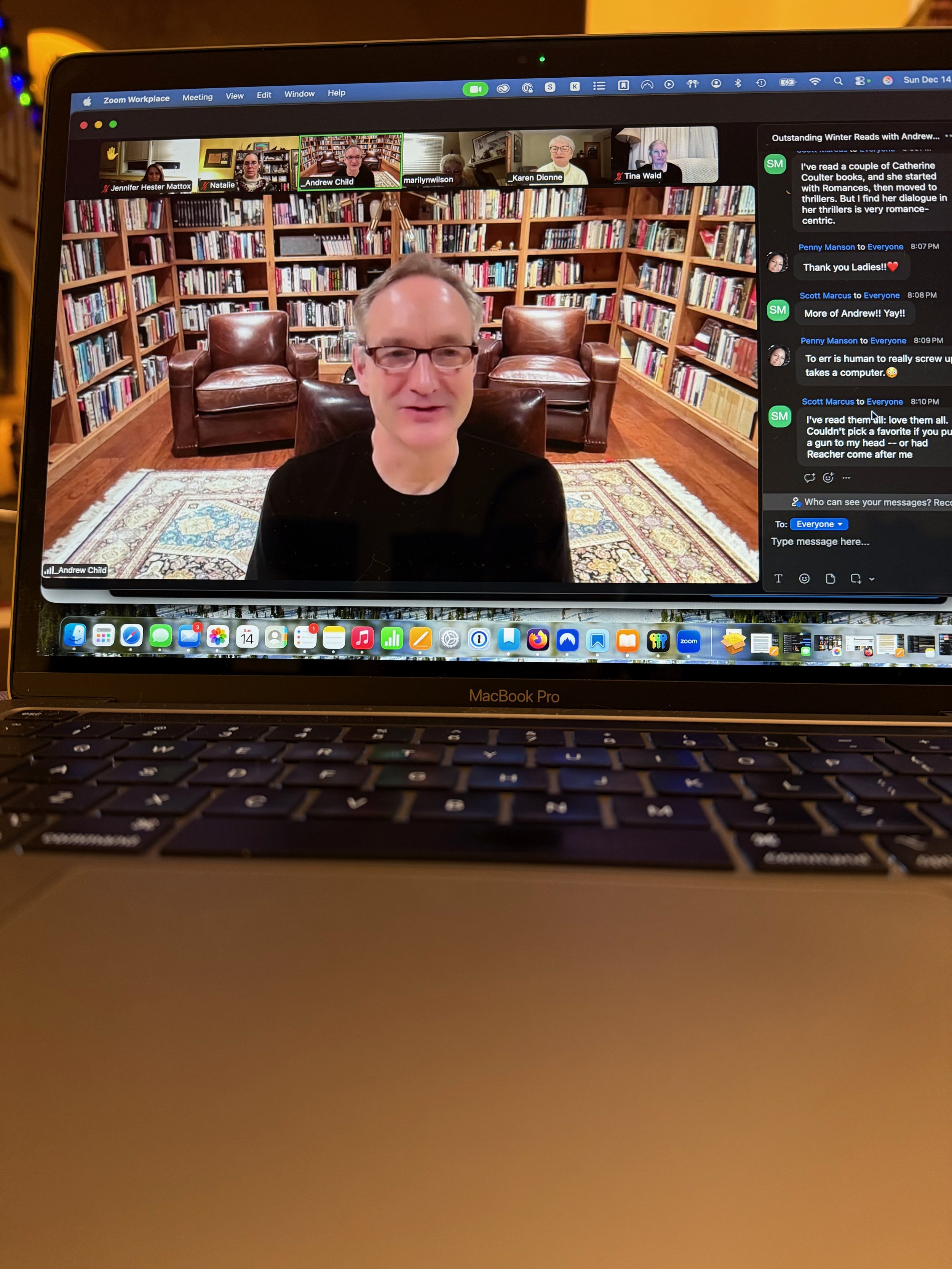 On the positive side, Andrew Child was able to spend the entire 30 minutes with our group. I thoroughly enjoyed my time with him as I learned so many intriguing details! Andrew coauthors the Jack Reacher series with his brother, Lee Child. I’m a fan of the series and have read the first 25 books. Andrew was present to discuss their latest novel, No Exit, the thirtieth book in the series. I appreciated Andrew’s candid responses and gained a deeper understanding of his role in the Reacher books. He revealed that he has been involved in the series since the first book as an early reader. He shared that he and Lee have always enjoyed discussing each book and brainstorming ideas for Reacher’s next adventure. He described his current role in the series as “a natural progression.”