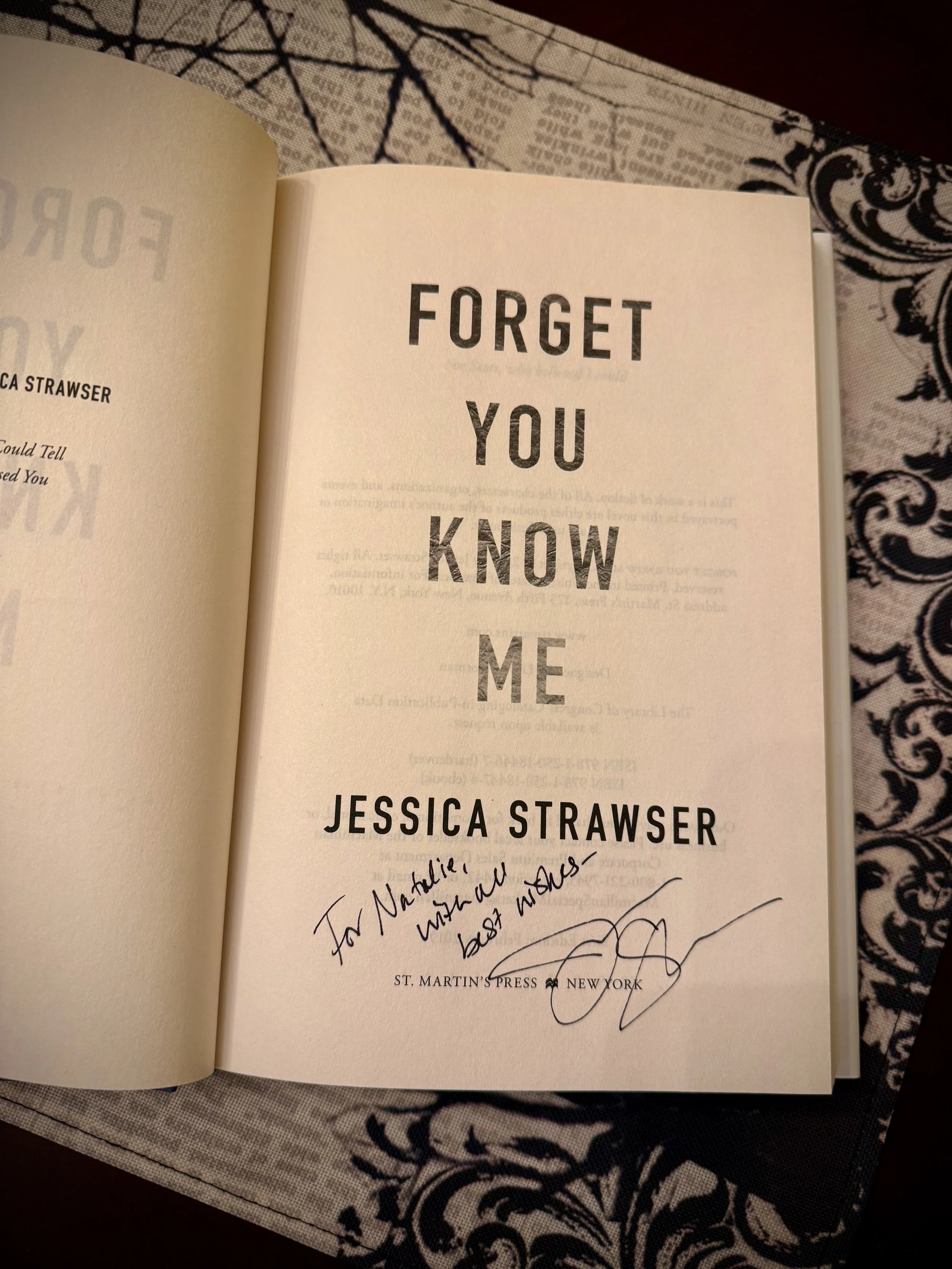 I was fortunate enough to acquire a copy of Forget You Know Me at a book festival, and Jessica graciously signed and personalized it for me.