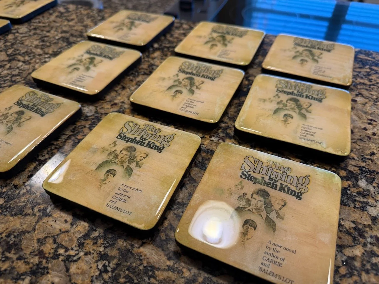 The Constant Reader book club had a chilling December meeting to discuss Stephen King’s The Shining. It’s been the perfect horror novel to devour this chilly, snowy December. I enjoyed discussing the book with 12 fellow King fans. The facilitators prepared thought-provoking discussion questions. It was interesting to hear everyone’s interpretations of the characters and scenes. My husband and I (mostly my husband) made The Shining coasters with the original book cover as holiday gifts for the book club members.